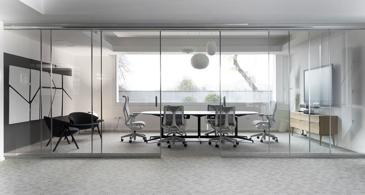 Le pareti divisorie permettono di ottimizzare e riconfigurare lo spazio, rivelandosi un’ottima soluzione sia per grandi ambienti che per sale riunioni più piccole.