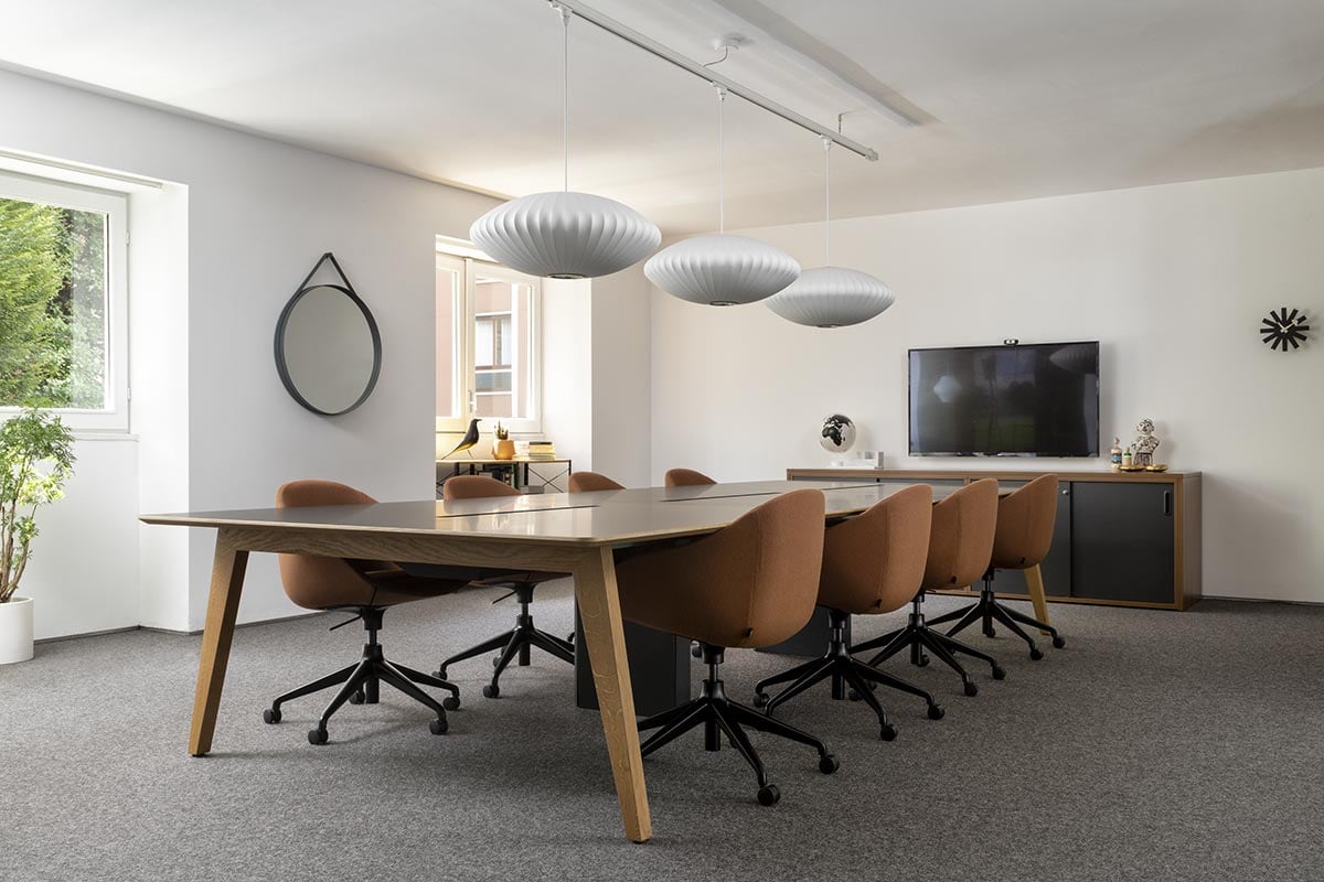 Le lampade da terra creano un’atmosfera più intima e raccolta: icone dell’illuminazione di design come le lampade da terra Arco di Flos, Twiggy di Foscarini e Cabildo di Artemide conferiscono alla sala riunioni stile ed eleganza senza tempo.