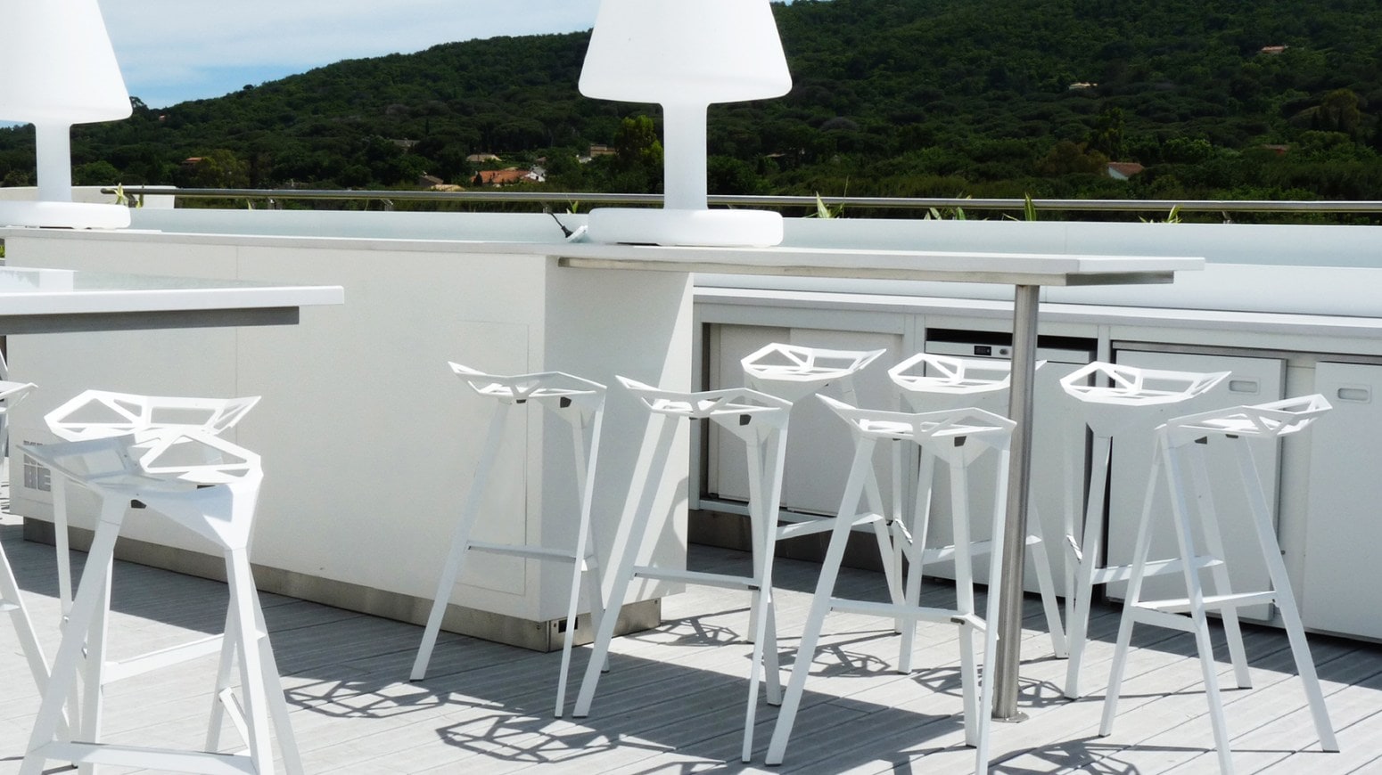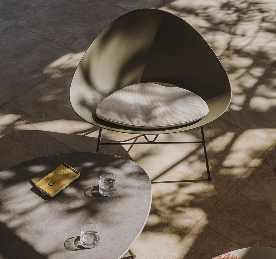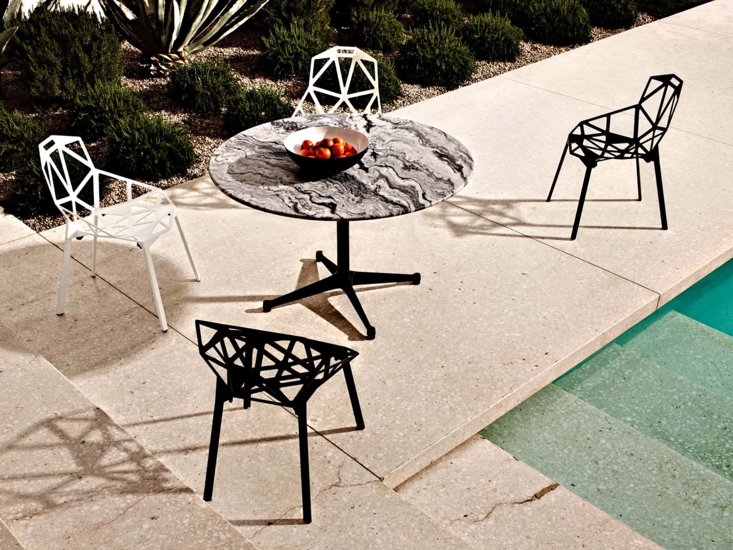 Di segno completamente opposto è l’iconica sedia Chair One, un design contemporaneo basato su una composizione di triangoli che crea un’impressione di leggerezza perfetta per gli spazi esterni. Chair One è disponibile nelle sue versioni con base in cemento, come sedia girevole e in una versione light: lo sgabello Stool One è un arredo avveniristico, ideale per aree snack esterne.