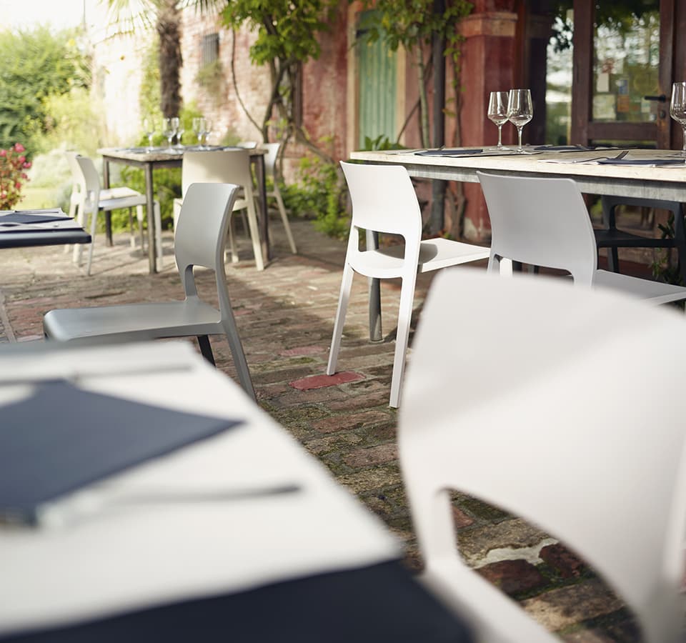 Una proposta più semplice e versatile è la sedia Juno, adatta per spazi pubblici e ambienti contract. La sua silhouette slanciata e il peso ridotto la rendono perfetta per allestire spazi esterni in modo versatile e modulabile a seconda delle esigenze.