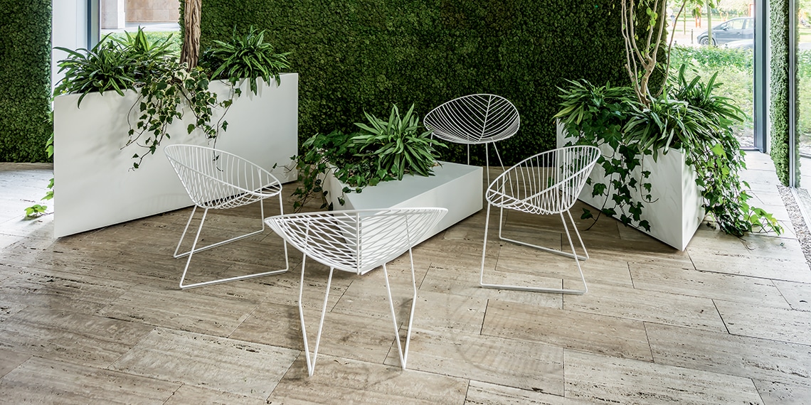 Tra i suoi prodotti per l’outdoor più celebri ci sono la sedia Leaf e la poltroncina Leaf, che rievocano una foglia stilizzata. Entrambe sono realizzate in tondino d’acciaio, resistenti e perfette per gli ambienti esterni come aree lounge outdoor o dedicate alla ristorazione.
