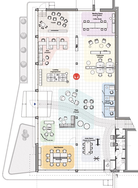 Quindi riprogettare, non solo per sfruttare con maggiore efficienza gli spazi a disposizione, ma per promuovere l’incontro e la connessione interna ed esterna tra professionisti e motivare maggiormente i collaboratori grazie a un supporto concreto alle diverse e nuove modalità di lavoro.