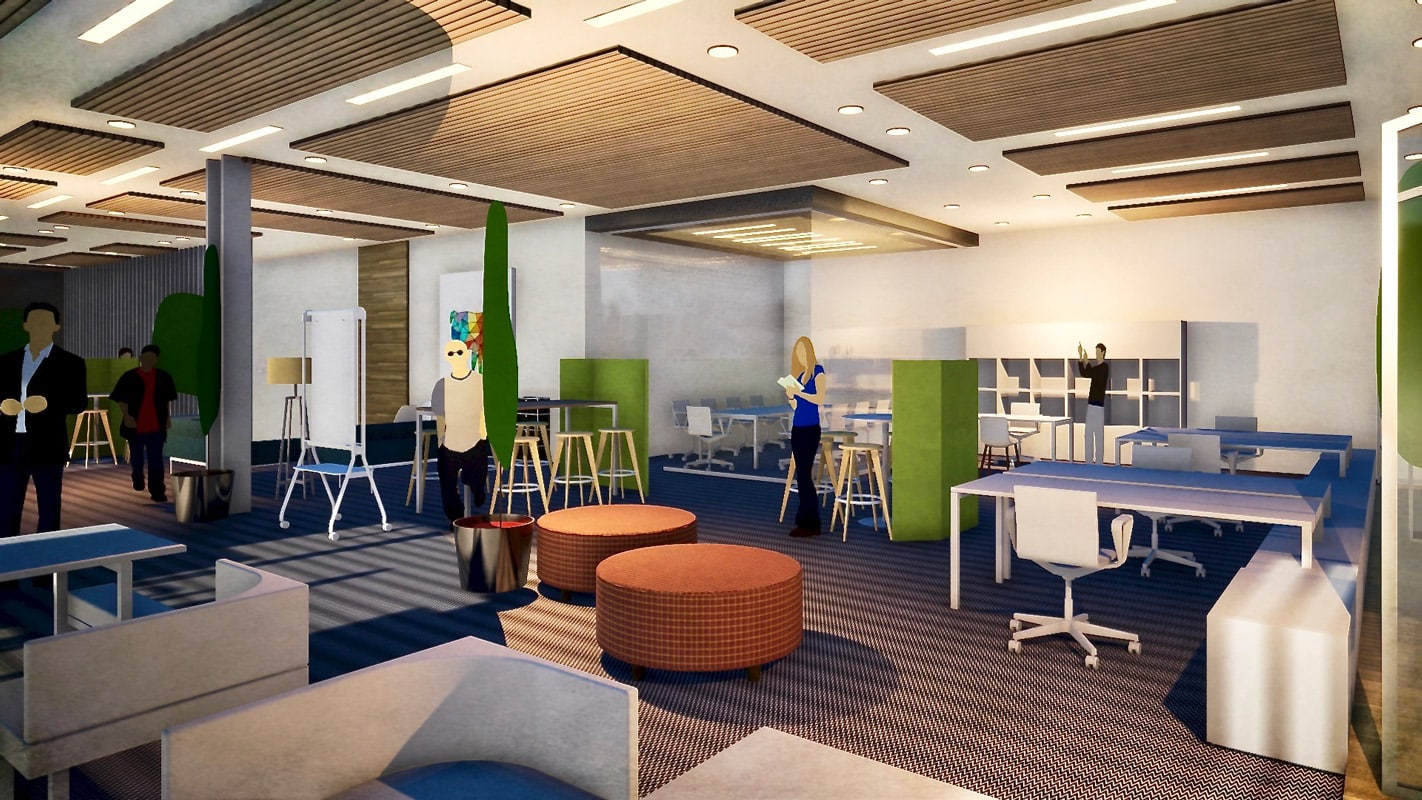 I piccoli e isolati uffici si trasformano in dinamici spazi condivisi in cui sono disponibili comode sedute e servizi che aiutano le persone a sentirsi più coinvolte e a migliorare le sinergie tra colleghi.