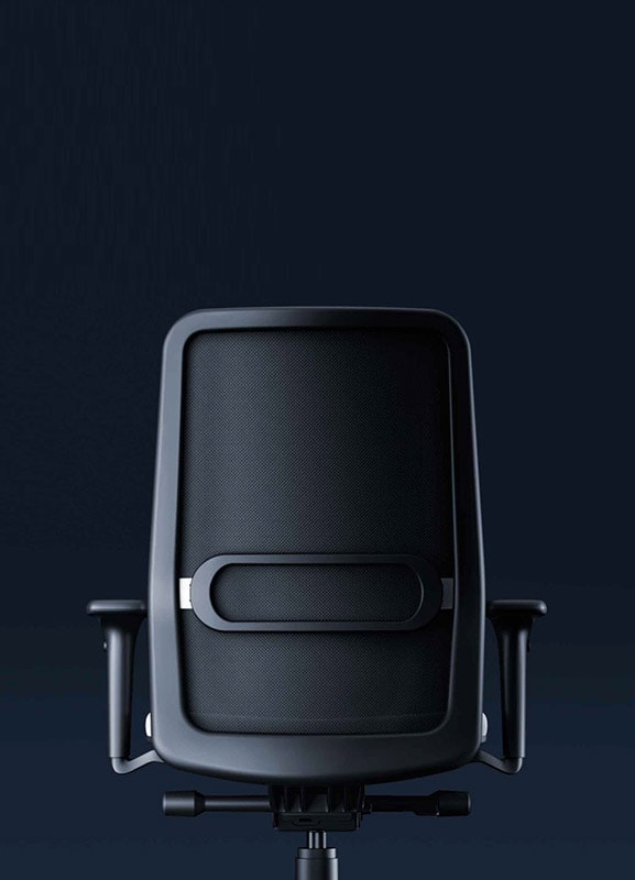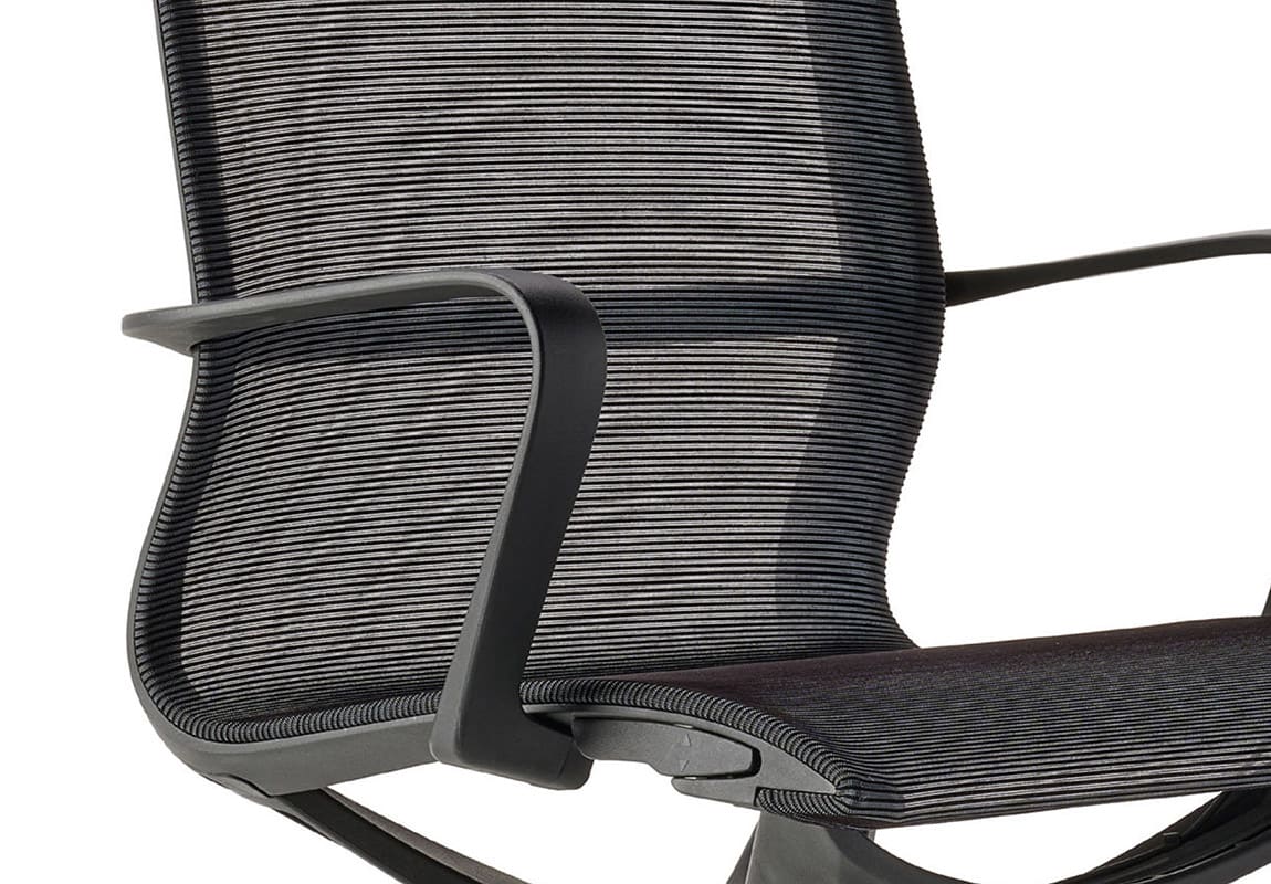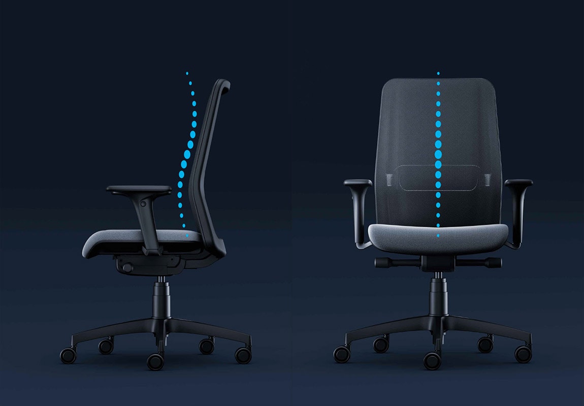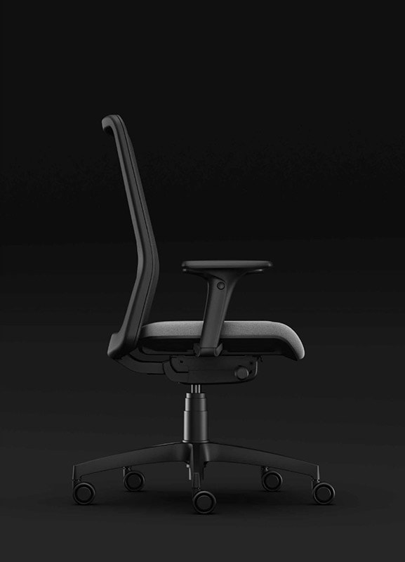 La poltrona per ufficio Yoga è una sedia ergonomica elegante e confortevole. Si caratterizza per il suo schienale sinuoso in rete nera con supporto lombare, che accompagna la colonna vertebrale e permette una maggiore traspirazione rispetto agli schienali tradizionali. I braccioli sono regolabili e rivestiti con una piacevole finitura soft-touch.