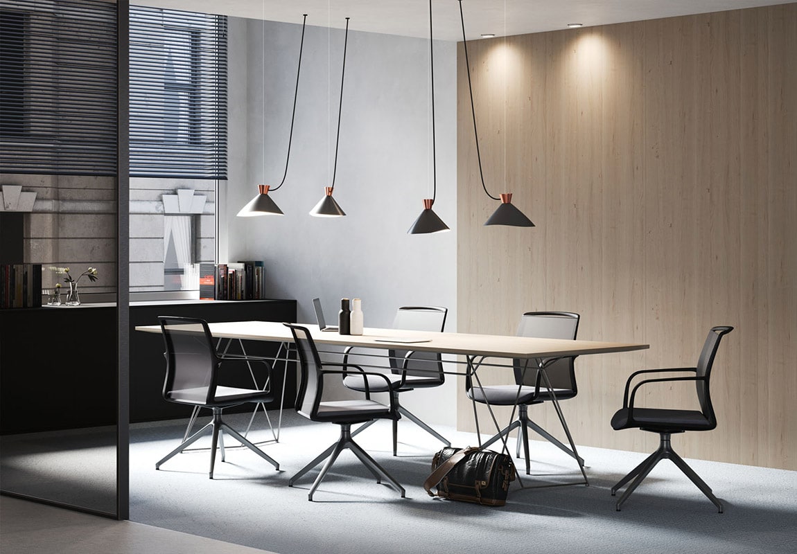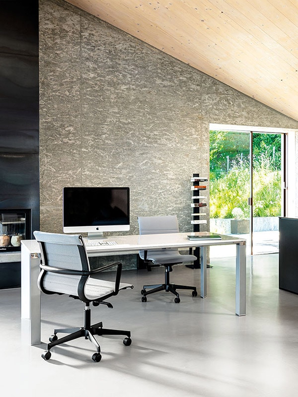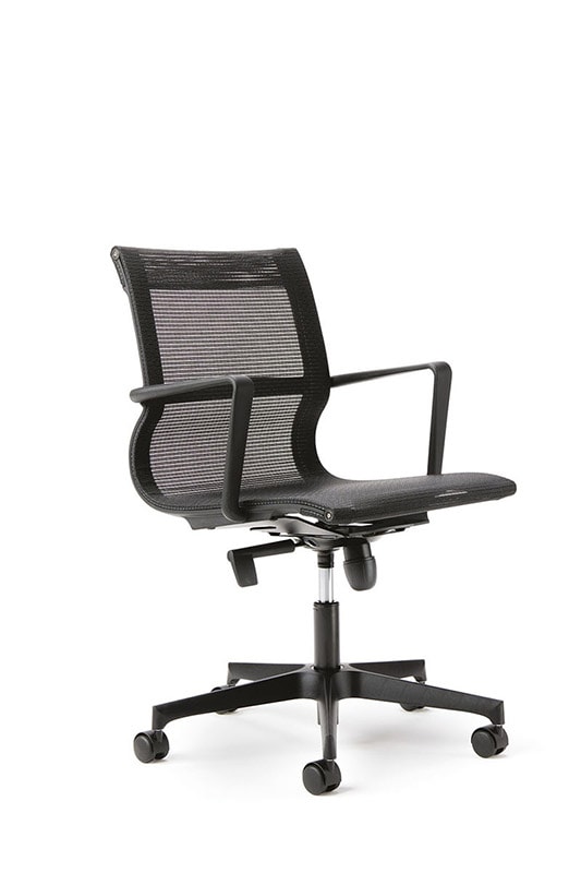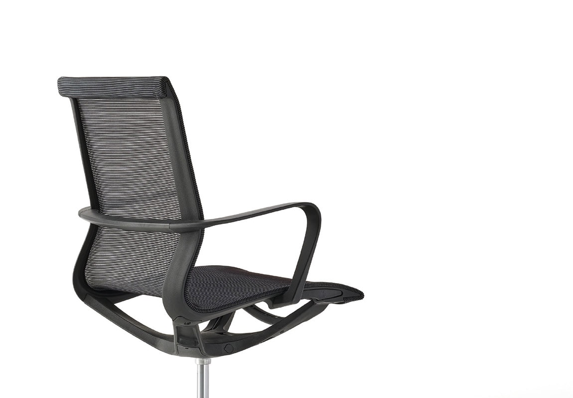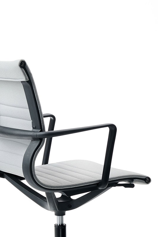La sedia Tekno è disponibile anche nella versione seduta girevole per ospiti o per sala riunioni, caratterizzata da uno schienale più basso.