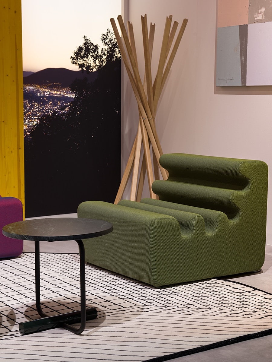 Linee morbide e generose caratterizzano anche il divanetto Buddy di Pedrali, che può essere configurato con accessori ed elementi abbinabili.