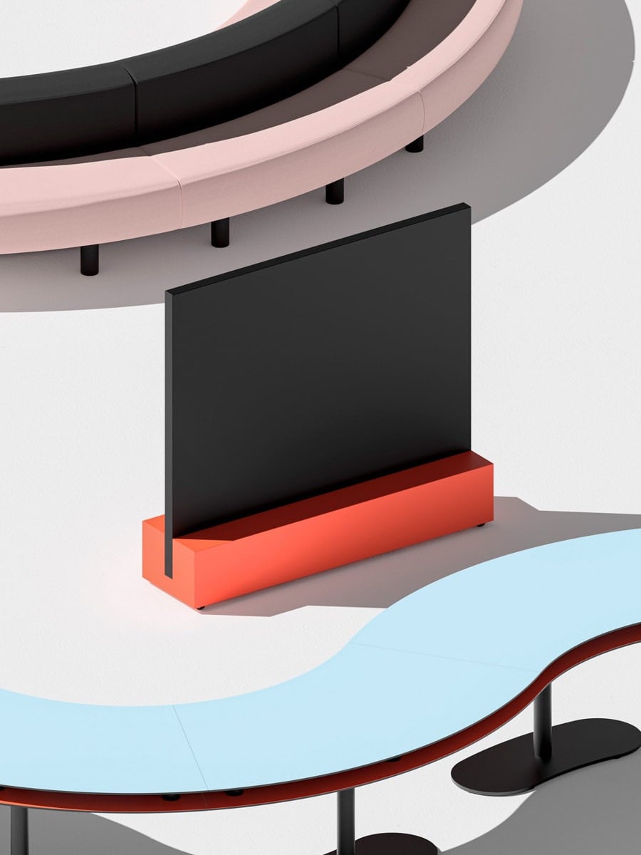 - SCREENS: gli schermi con base multifunzione si trasformano di volta in volta in lavagne magnetiche, pannelli acustici, moduli audio e video, vasi da fiori, appendiabiti e lampade da terra.