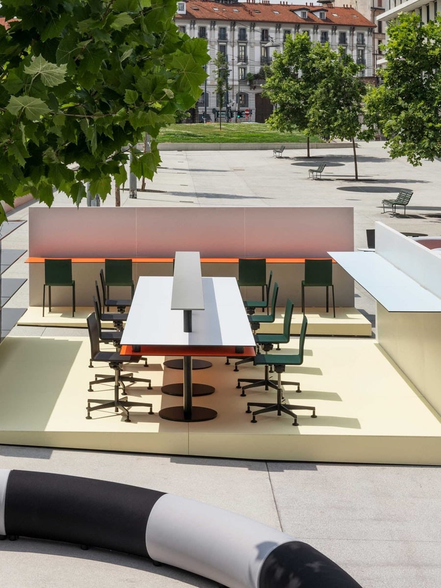 L’installazione è un percorso di scoperta attraverso le possibilità di re-immaginazione degli spazi di lavoro contemporanei in chiave flessibile e piacevole.