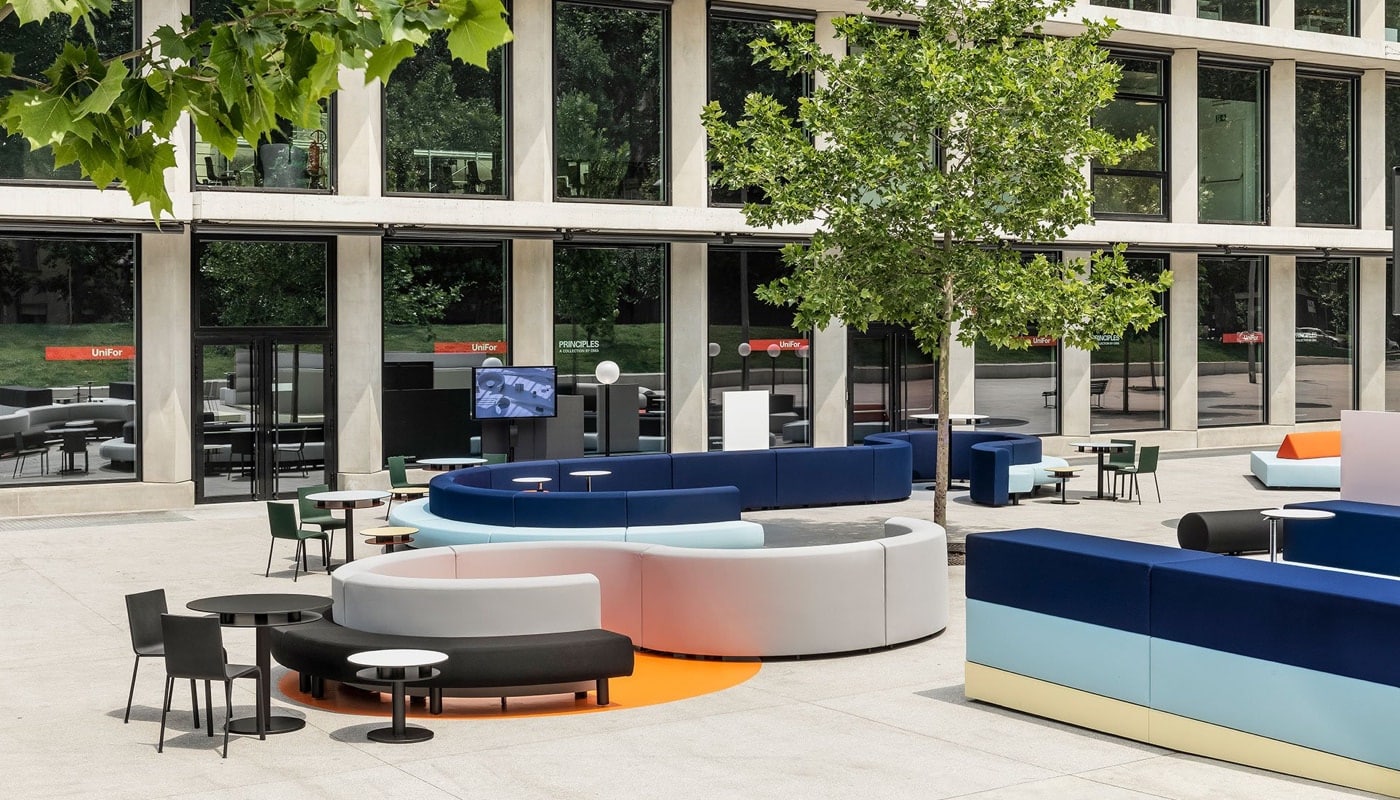 I nuovi spazi UniFor sono stati allestiti per mostrare tutte le potenzialità di PRINCIPLES e le infinite combinazioni. L’installazione riproduce scene di lavoro sia negli spazi interni che nel cortile esterno, sfruttando la flessibilità della collezione per creare ambienti insoliti di lavoro e relax, zone dedicate allo staff e aree pubbliche.