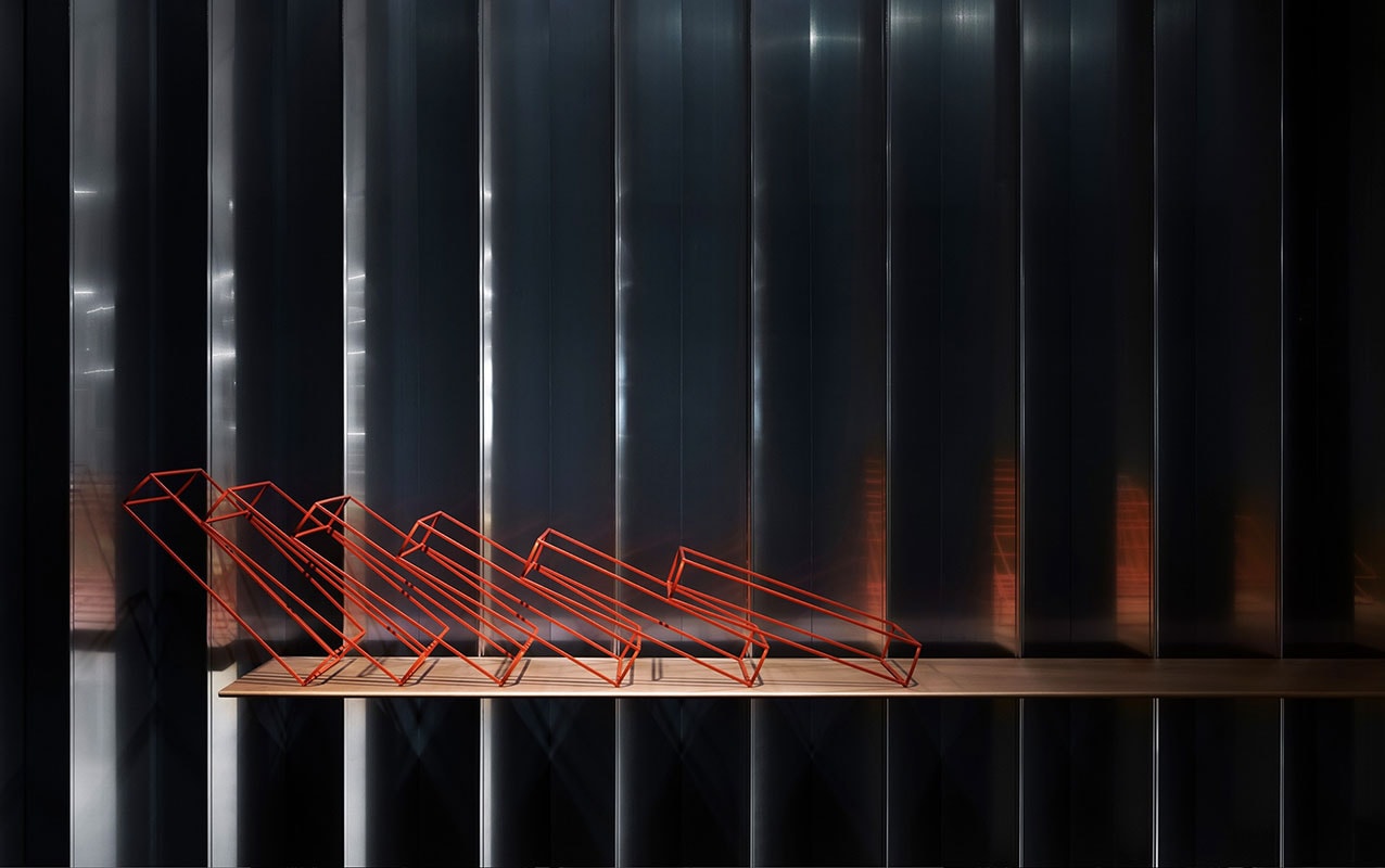 All’esterno, una struttura metallica rappresenta l’interazione tra libri e mensola, in una fusione tra astratto e funzionale che rappresenta lo stile di Ron Gilad.