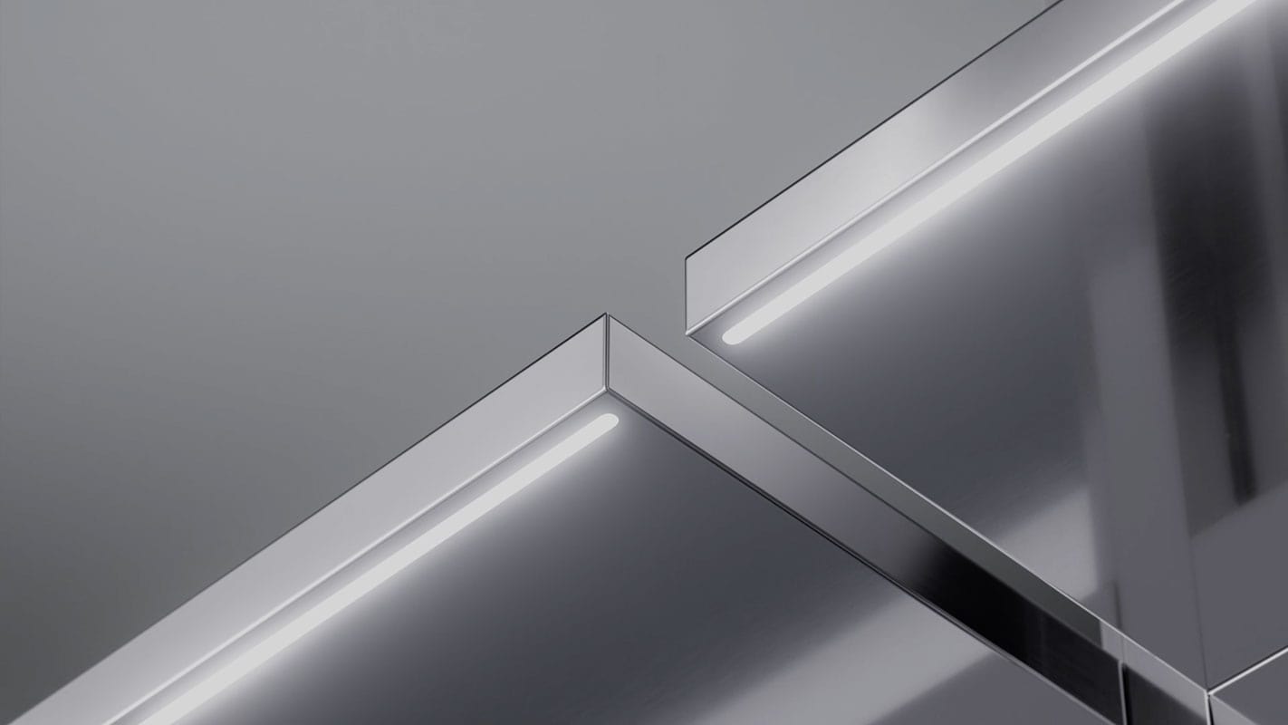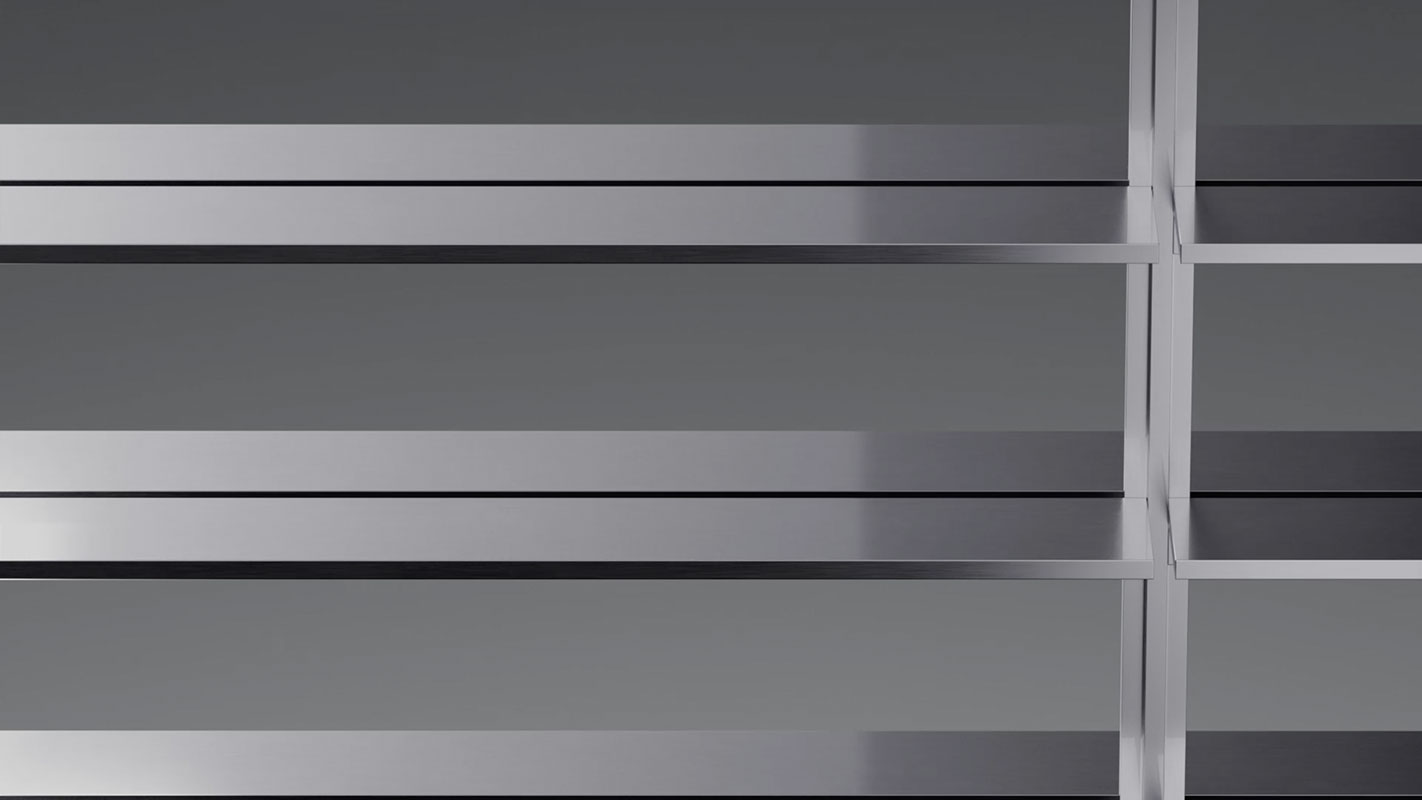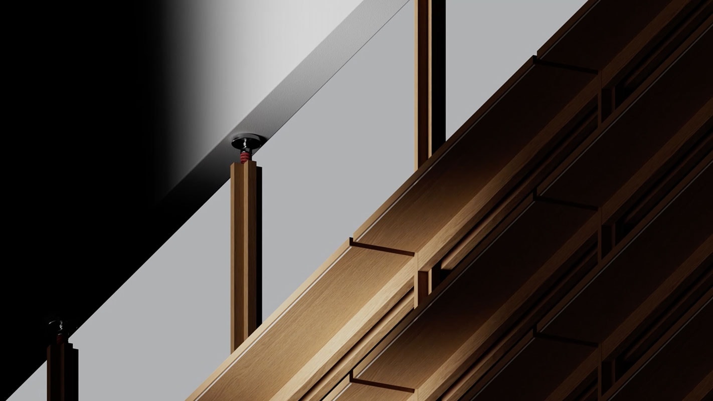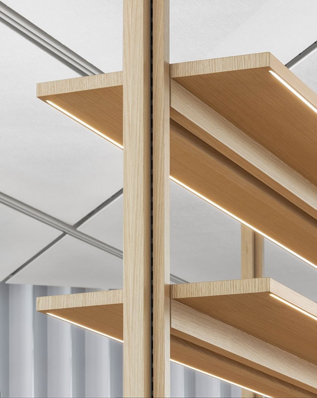 Nel progetto UniFor by Snøhetta, legno e metallo convivono con elementi tecnologici, come il sistema di illuminazione integrato e il connettore, che unisce ripiani e montanti tra loro e li collega al sistema di elettrificazione.