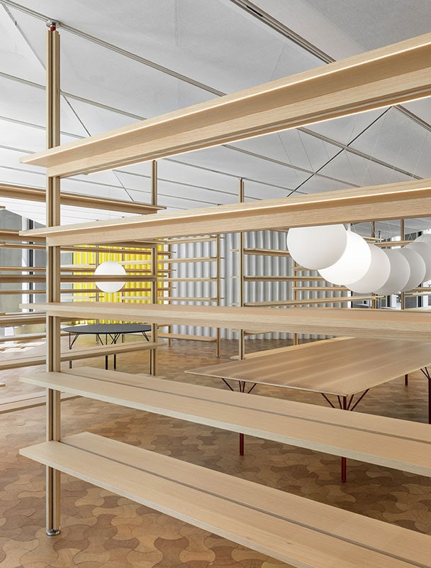 La libreria Bokhus è stata progettata dallo studio di architettura Snøhetta, frutto di uno studio iniziato nel 2019 con UniFor per esplorare il futuro delle biblioteche come luogo di conoscenza e socializzazione.
