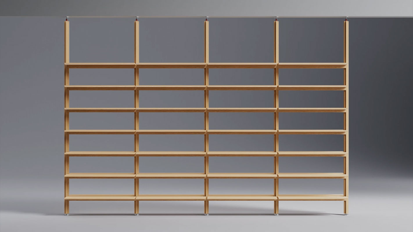 La libreria X è caratterizzata da un montante a croce e mensole, che creano un elemento soffitto-pavimento che definisce lo spazio e separa le diverse aree di lavoro, mantenendo la visuale libera.