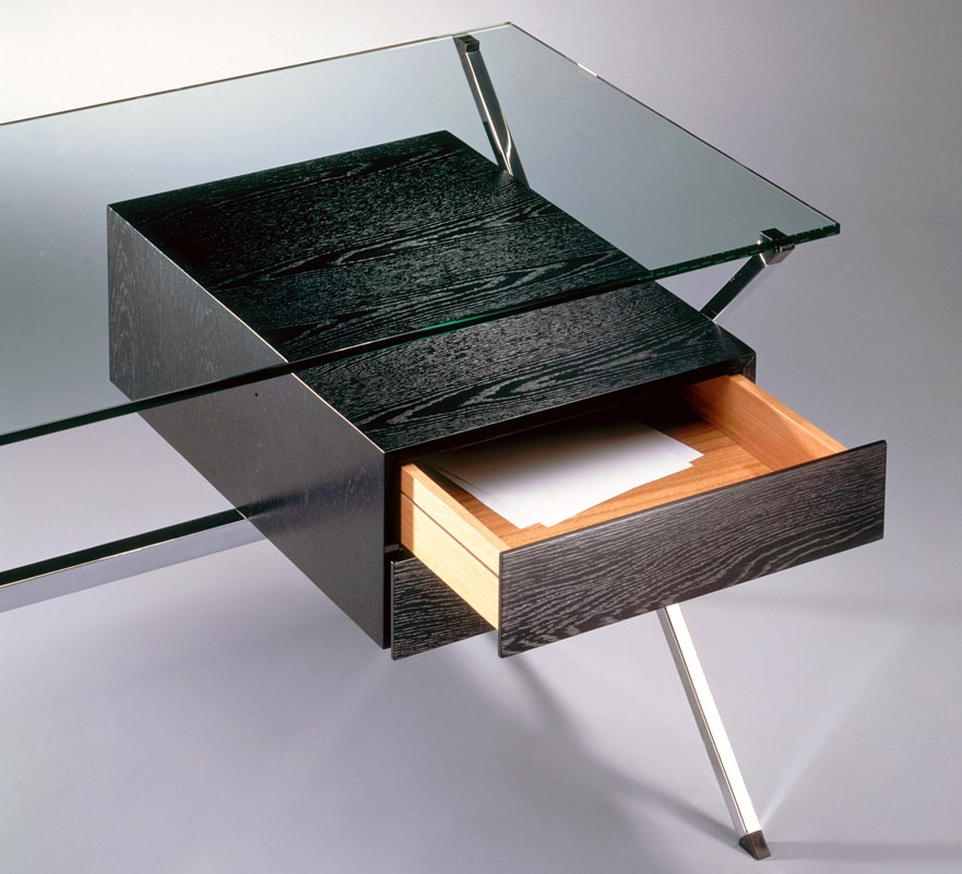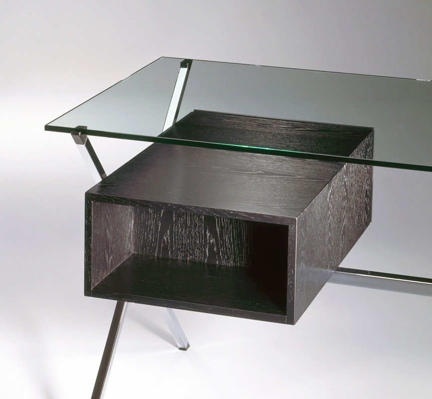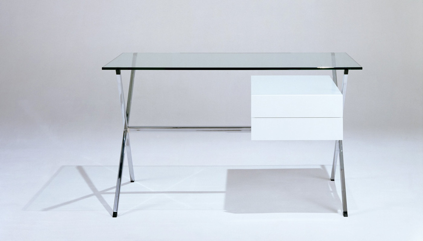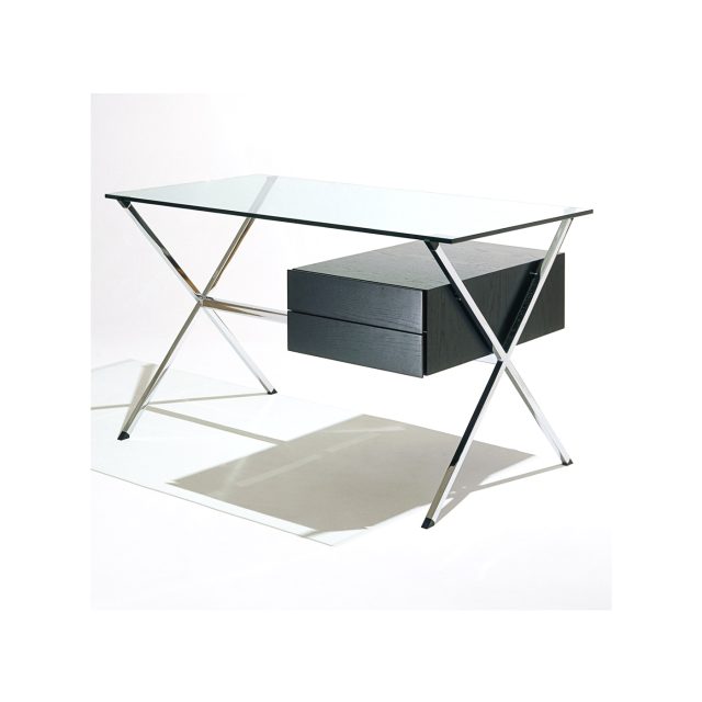 La scrivania, corredata da una cassettiera in legno verniciato, con il piano in cristallo e la struttura cromata lucida è un singolare esempio di semplicità ed equilibrio.
