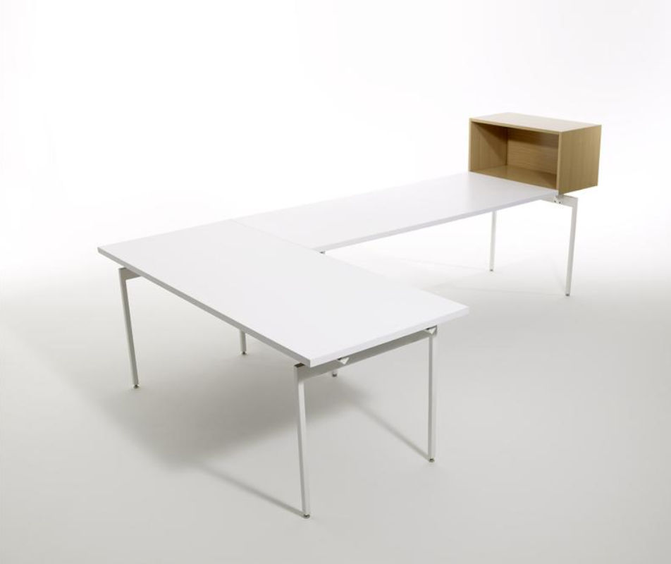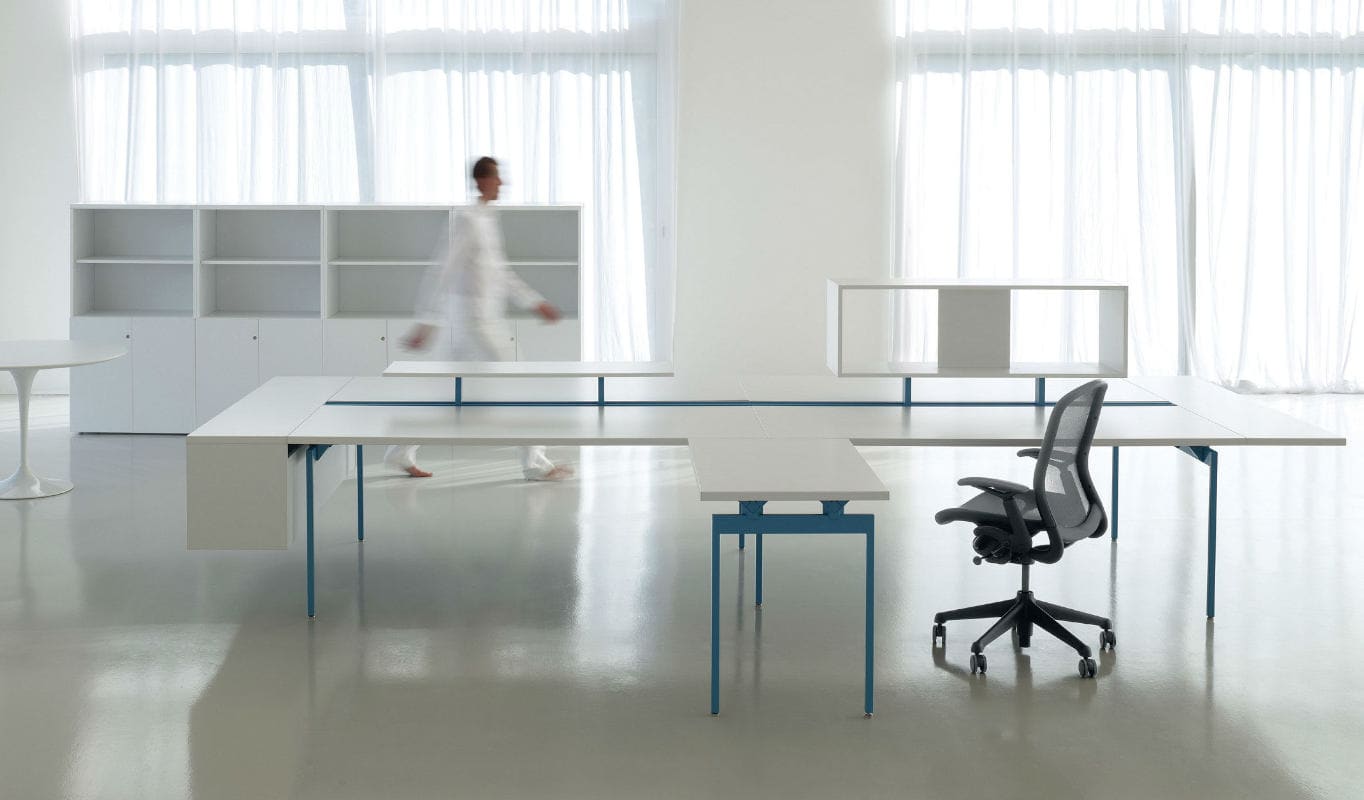 Partendo da una struttura con gambe e piano di lavoro semplici e modulari, lo studio Antenna Design ha sviluppato componenti, connessioni e transizioni che massimizzano l’usabilità e la flessibilità degli arredi, un numero minimo di pezzi per infinite possibilità di configurazione (vedi catalogo).