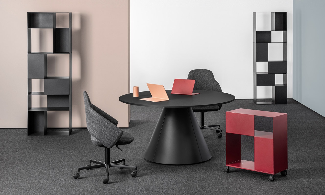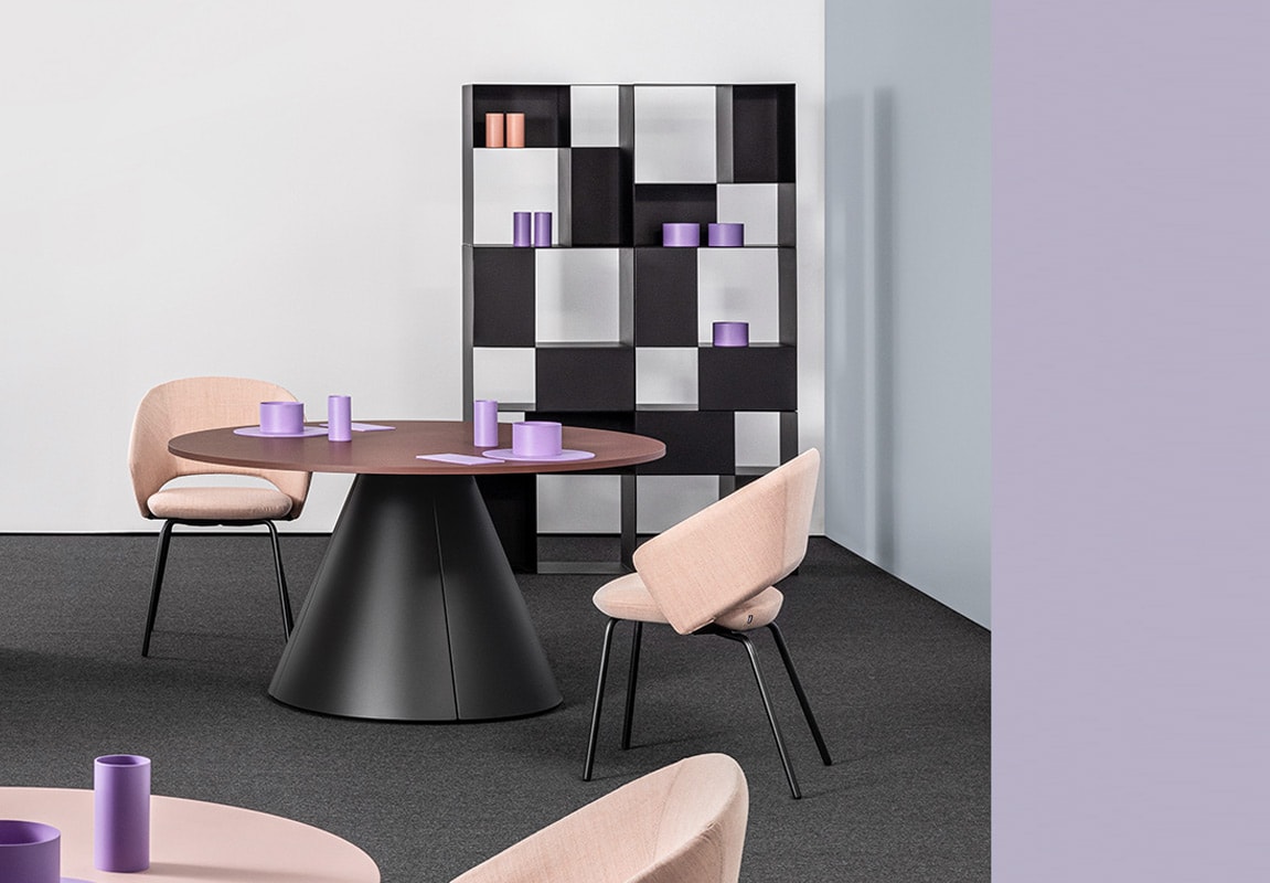 Il basamento a forma di cono conferisce al tavolo un aspetto più residenziale, rendendolo adatto anche all’inserimento in spazi dedicati all’homeoffice.