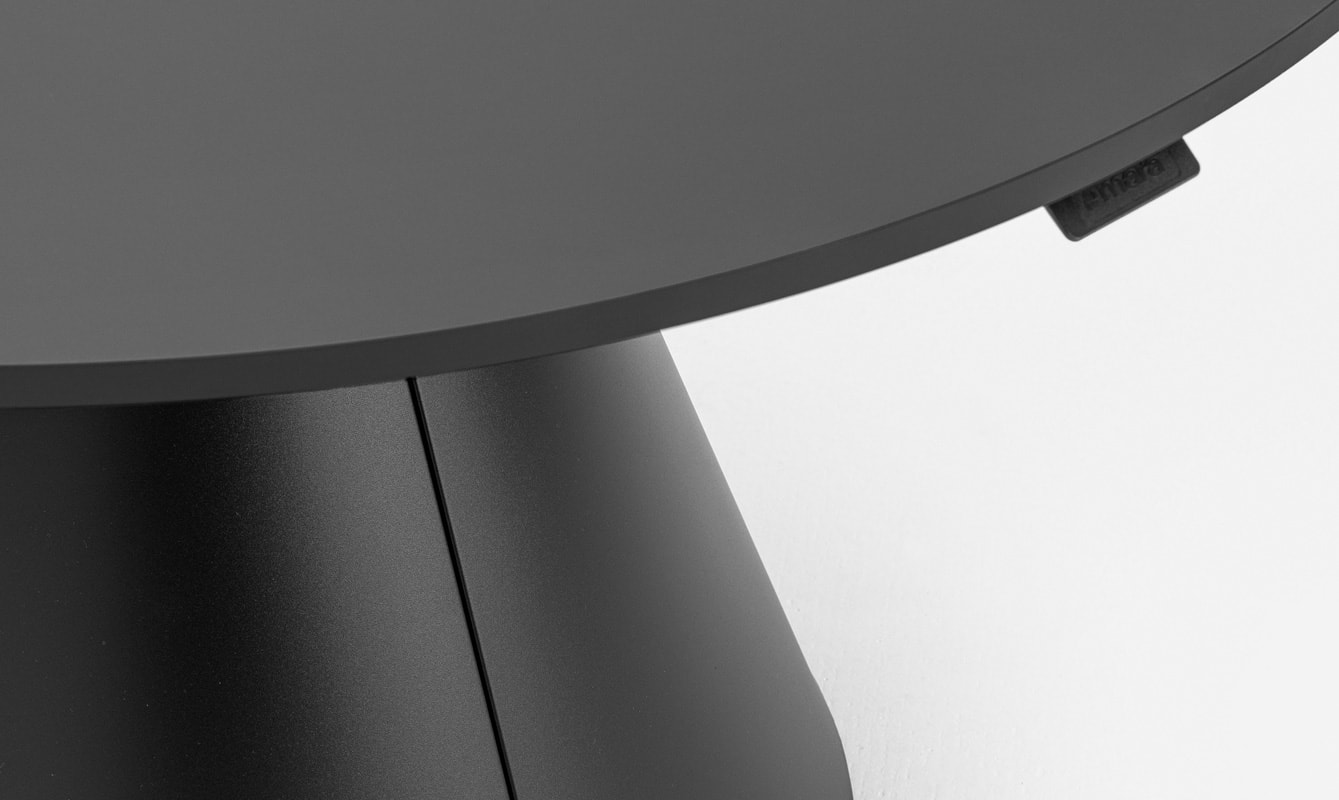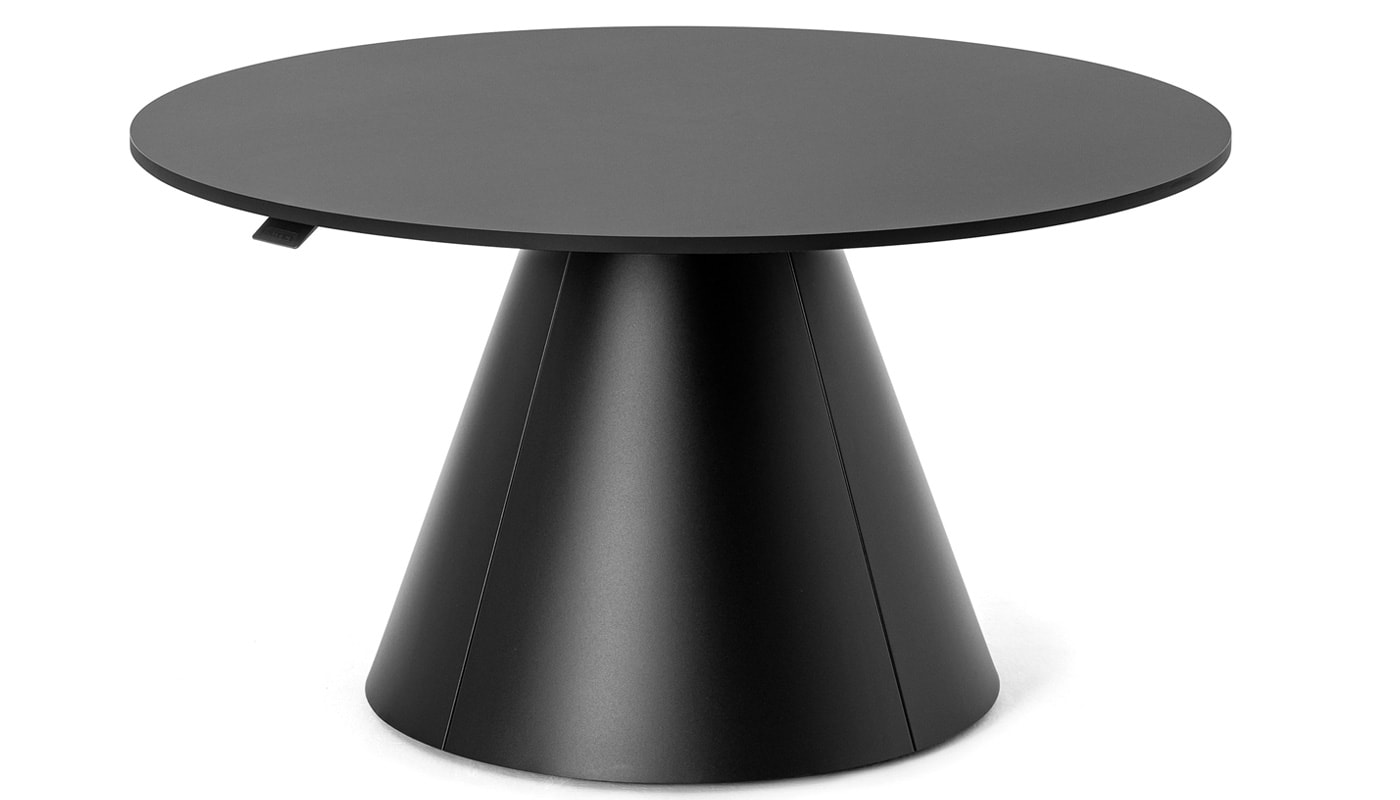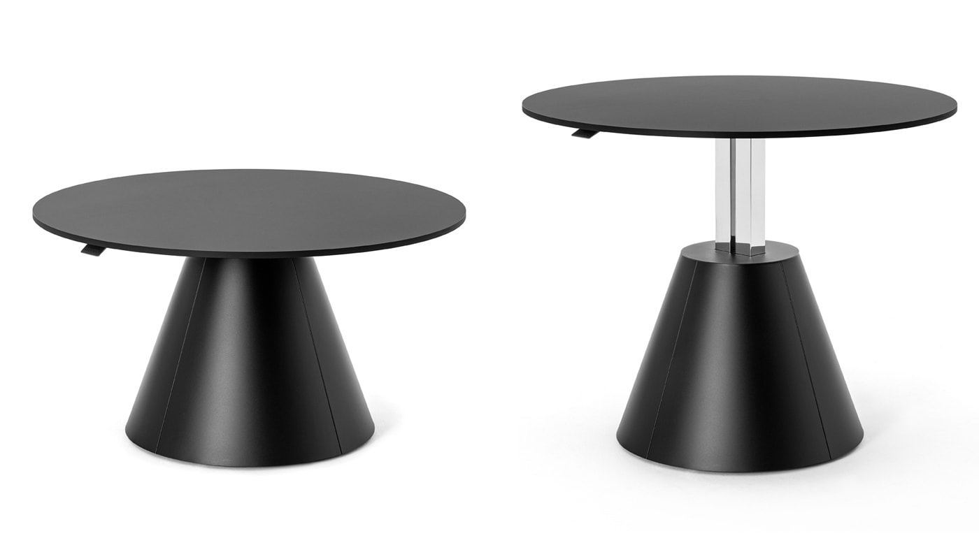 La collezione di tavoli sit-stand Follow di Mara si arricchisce del modello Follow Meeting Cone, un tavolo regolabile in altezza con un basamento a base conica.