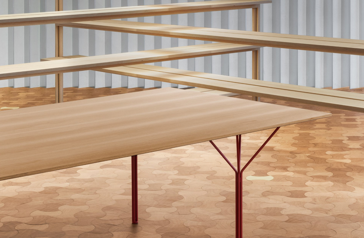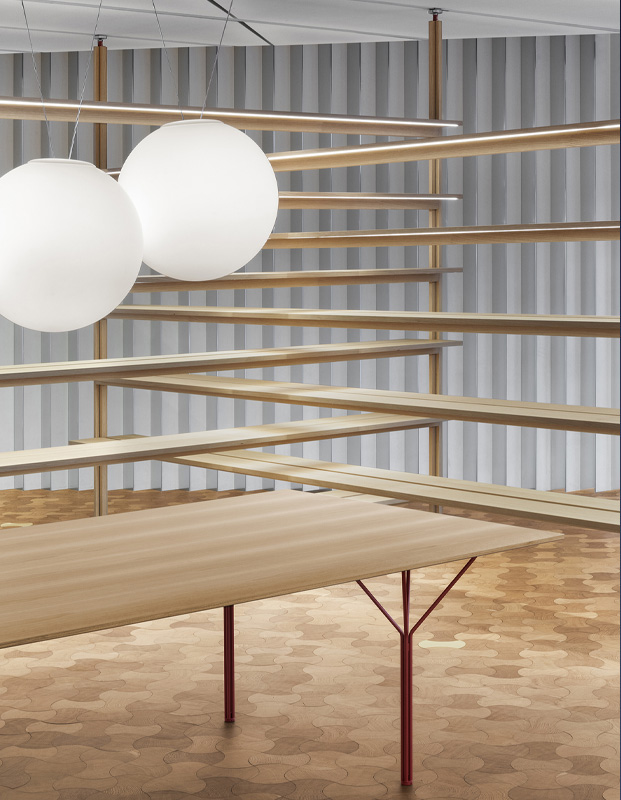 La geometria pura si combina con una palette materica sofisticata: legno naturale, linoleum e laminato, selezionati con cura per adattarsi ad ogni esigenza progettuale e sensoriale.