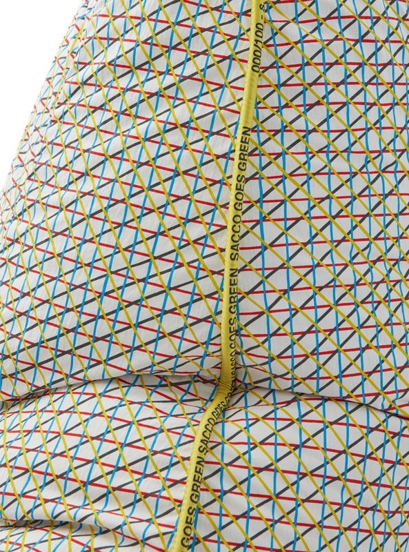 Il designer francese, ispirandosi al concetto di “rete”, ha sviluppato un fitto intreccio di linee colorate declinato in tre varianti cromatiche, pensato per adattarsi armoniosamente alle diverse configurazioni di Sacco senza alterarne l’impatto visivo.