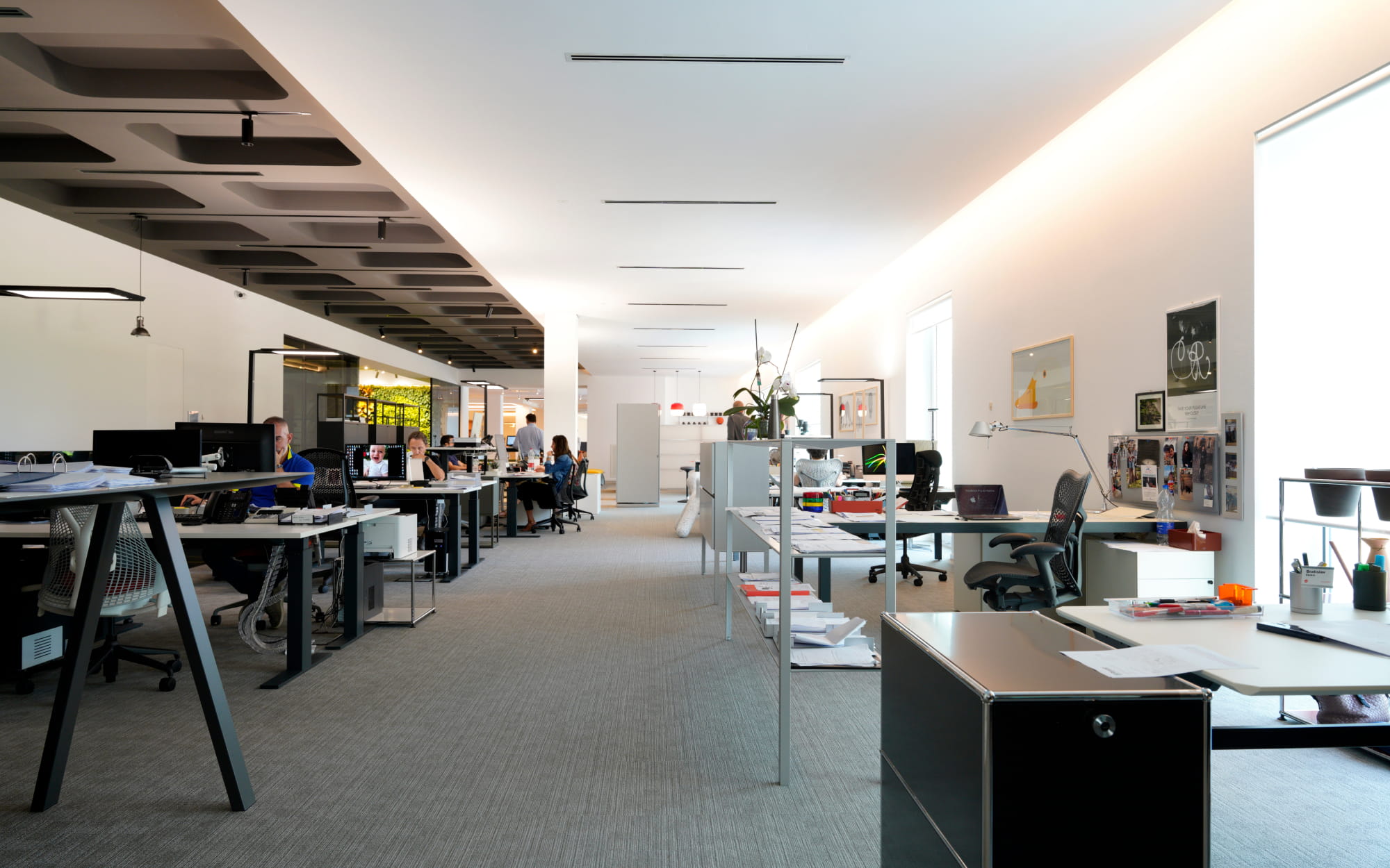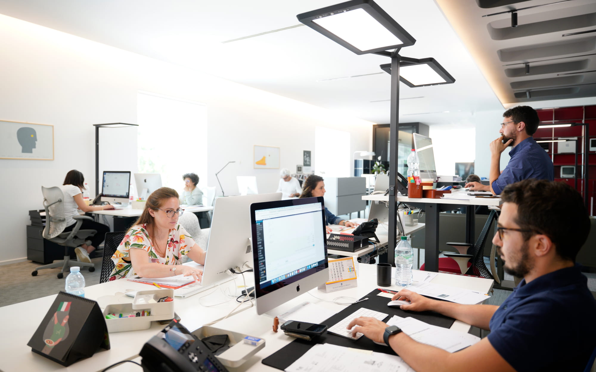 L’area operativa Della Chiara è un open space dinamico e ragionato, progettato per favorire la contaminazione delle idee e stimolare un processo di formazione continua, per la crescita di tutto il team.