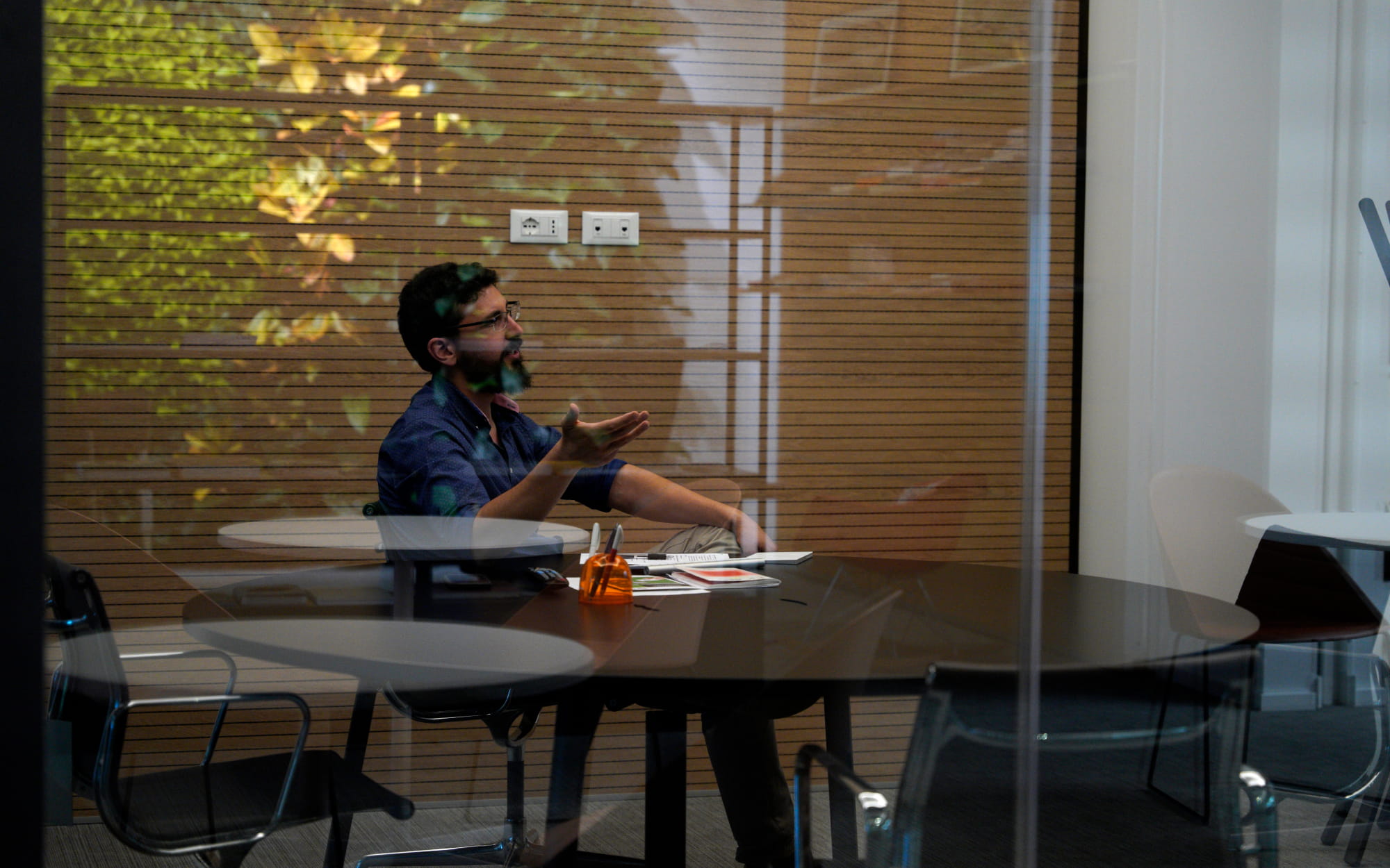 Glass office delimitati da pareti vetrate RP, progettate da Renzo Piano, equipaggiate con schermi touch multifunzione.